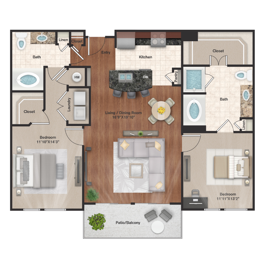 Rendering of the B16 floor plan with 2 bedroom[s] and 2 bathroom[s] at IMT Uptown Post Oak